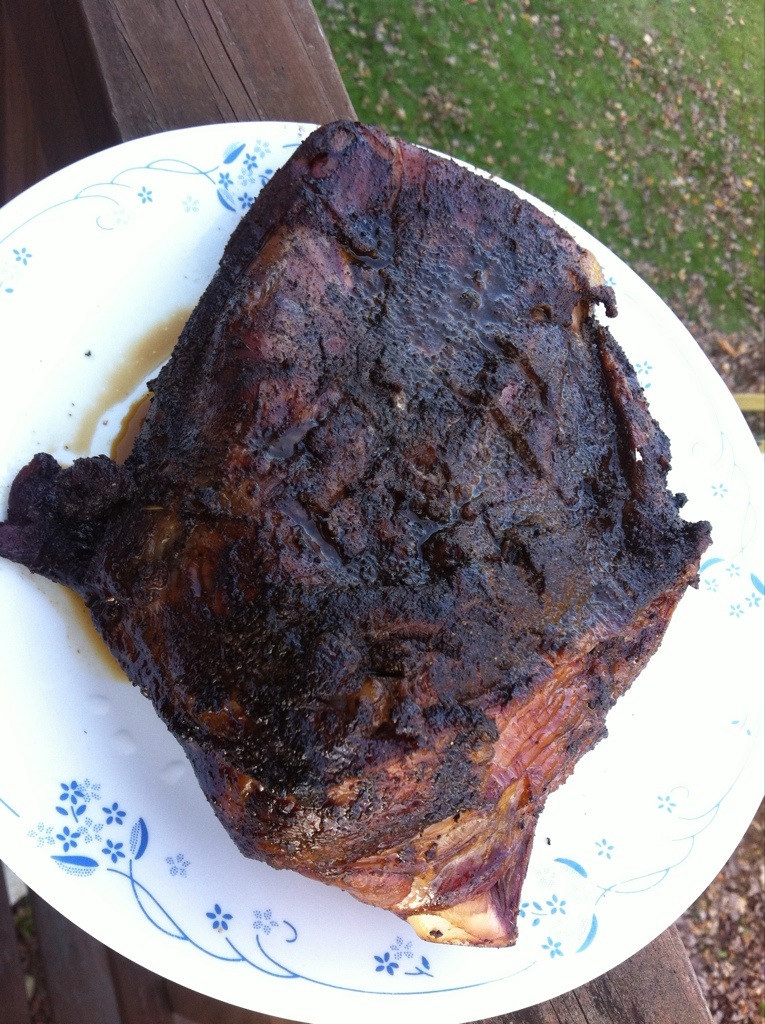 This was a bone-in shoulder roast and it was done in about an hour, I made a mop of beer, honey, garlic and kalamata olive juice.