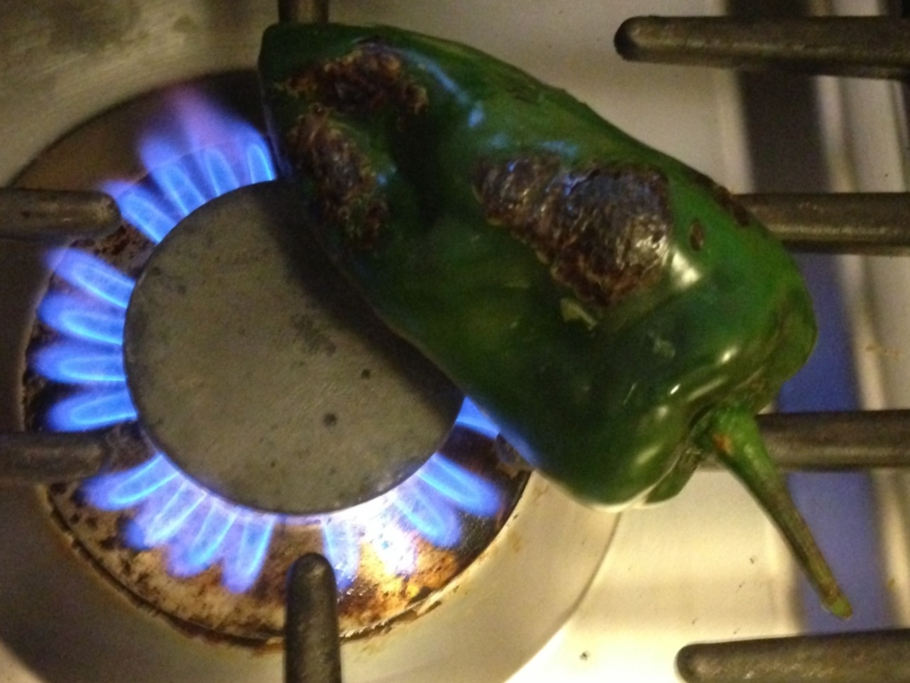 Flame roast those peppers directly on your gas flame if you have one. About 30 seconds a side or until you get a nice char. Ummmm- be careful too, open flame and all.