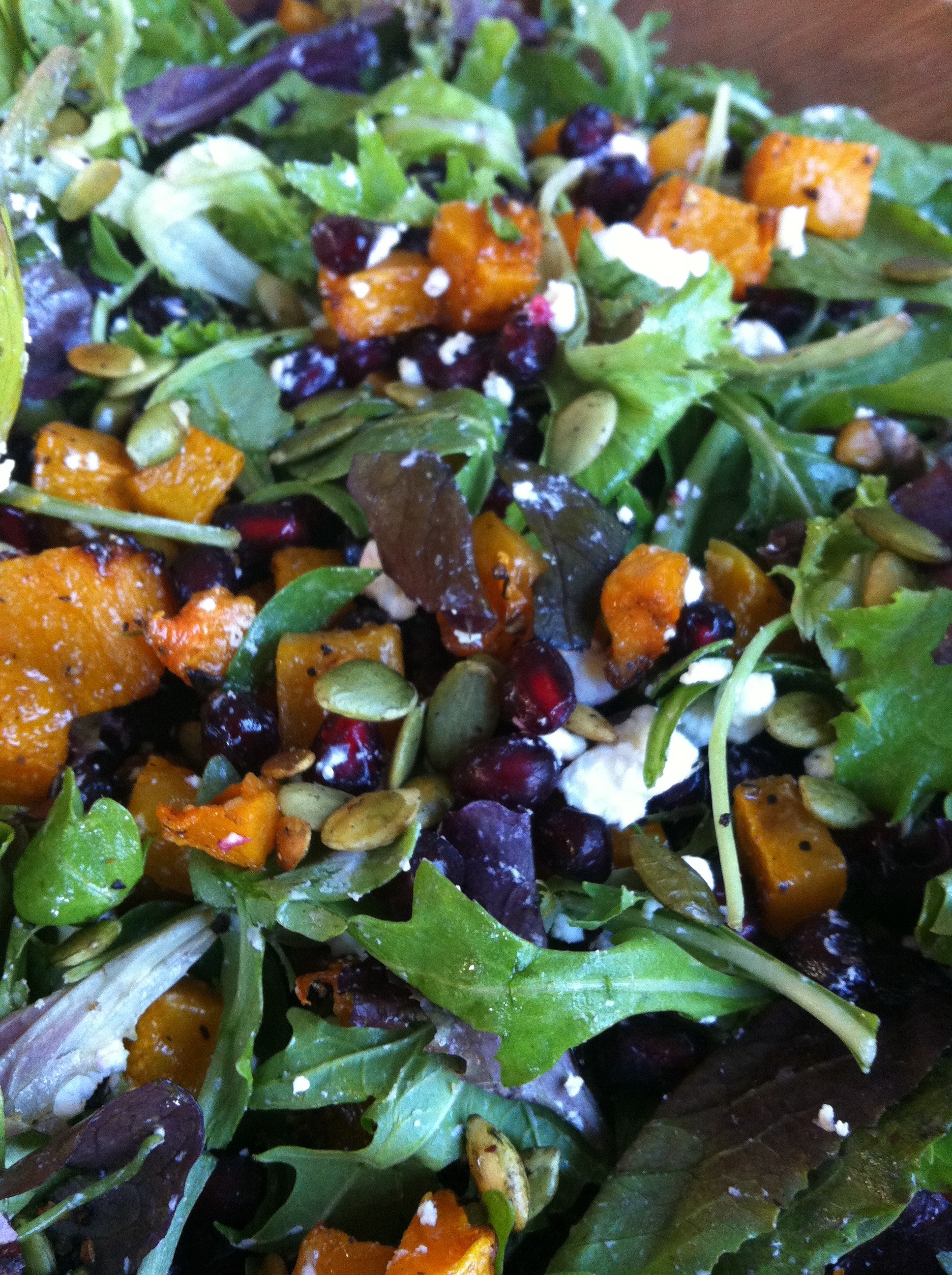 Diced cubes of butternut squash, tossed in olive oil, salt and fresh ground pepper. Roasted on 400* until caramelized. Fresh pomegranate seeds, so good right now. Pepita or pecans, pan toasted with salt and smoked chili flakes. Goat Cheese.
